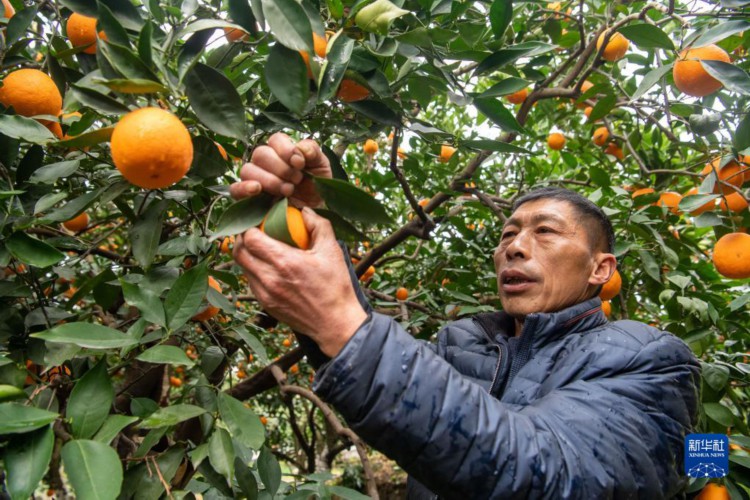2月28日,在重庆市奉节县永乐镇大坝村的脐橙种植园内,农户在采摘脐橙。