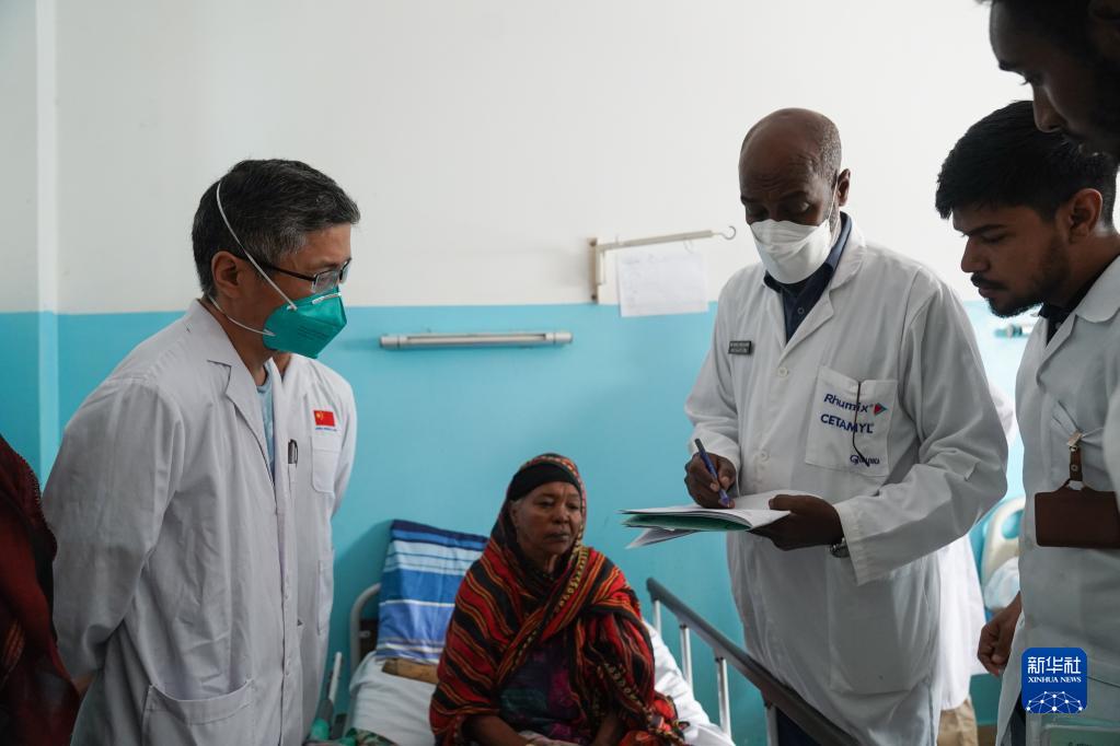 3月1日,在吉布提首都吉布提市贝尔蒂耶医院,中国第21批援吉布提医疗队医生与当地医生一起查房。 中国第21批援吉布提医疗队于2022年1月抵达位于非洲东北部亚丁湾西岸的吉布提,在首都吉布提市贝尔蒂耶医院开始为期15个月的援外医疗任务。截至2023年2月底,医疗队共完成门诊14658人次,急诊576人次,完成手术1168台。 新华社记者 韩旭 摄