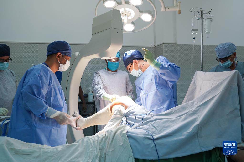 3月1日,在吉布提首都吉布提市贝尔蒂耶医院,中国第21批援吉布提医疗队医生赵鹏(右二)、张澍(左二)为当地患者做手术。 中国第21批援吉布提医疗队于2022年1月抵达位于非洲东北部亚丁湾西岸的吉布提,在首都吉布提市贝尔蒂耶医院开始为期15个月的援外医疗任务。截至2023年2月底,医疗队共完成门诊14658人次,急诊576人次,完成手术1168台。 新华社记者 韩旭 摄