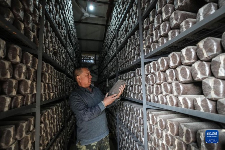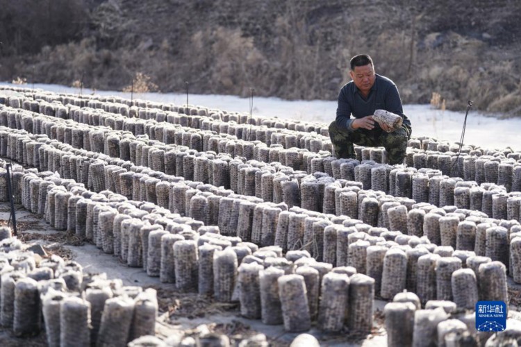 3月4日,“百姓雷锋”侯清林在查看菌棒的情况。