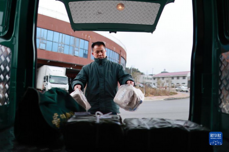 在贵州省龙里县草原路邮政邮件处理中心外,莫富元将当天需要投递的物品拿上小货车(2月14日摄)。