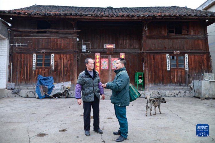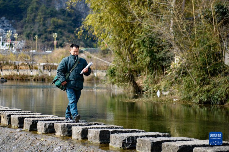 在贵州省龙山镇,莫富元准备投递邮报(2月14日摄)。