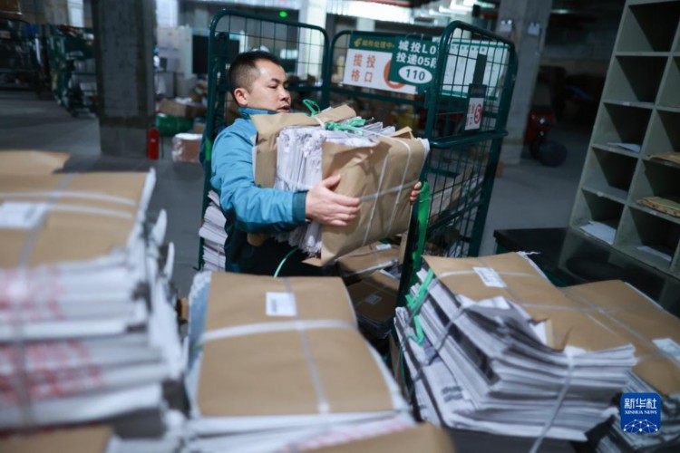 莫富元在贵州省龙里县草原路邮政邮件处理中心分拣当天的报纸(2月14日摄)。