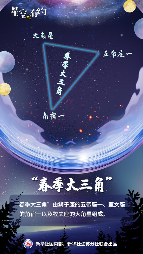 春季夜空的另一组“明星”是“春季大三角”。它由狮子座的五帝座一、室女座的角宿一以及牧夫座的大角星组成,这三颗星在春季夜空中非常明亮。