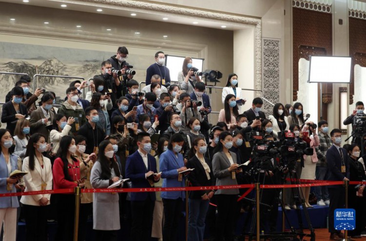 3月7日,全国政协十四届一次会议第二场“委员通道”集体采访活动在北京人民大会堂新闻发布厅举行。这是记者在现场举手提问。 新华社记者 曹灿 摄