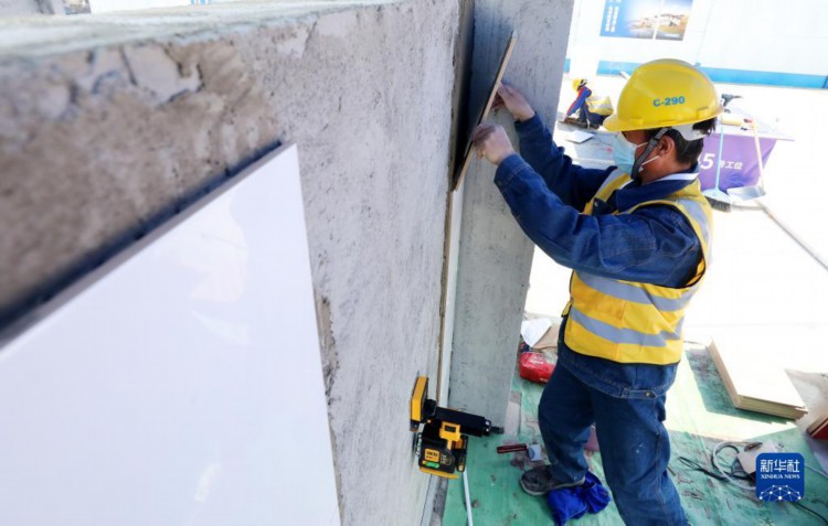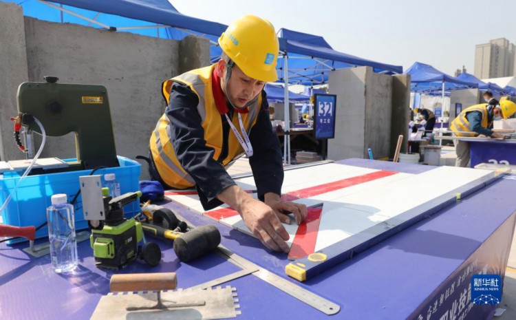 3月6日,参赛选手在进行装饰装修工(镶贴工)项目比赛。