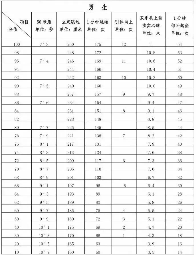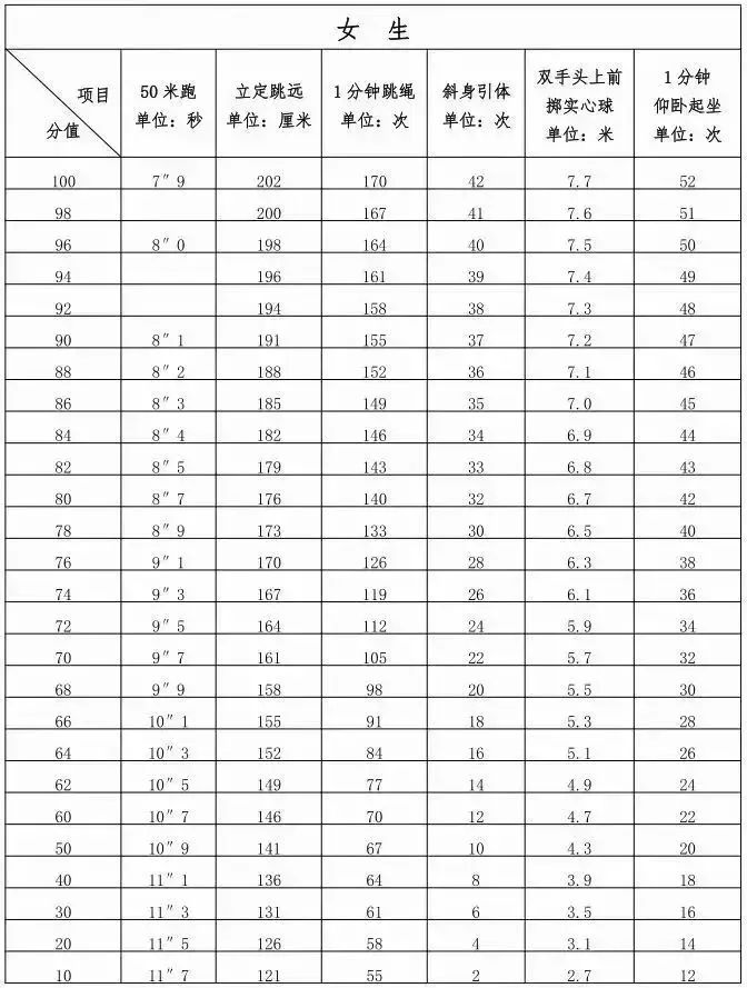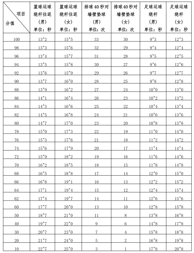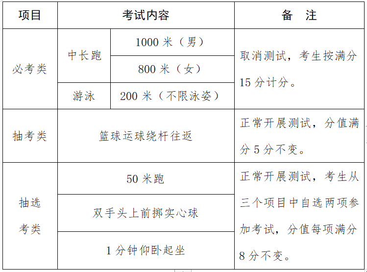 取消必考类项目测试,所有考生必考类项目按满分计入身体素质与运动技能测试总分。抽考类和抽选考类项目正常组织测试,分值不变。调整后的测试项目见下表: