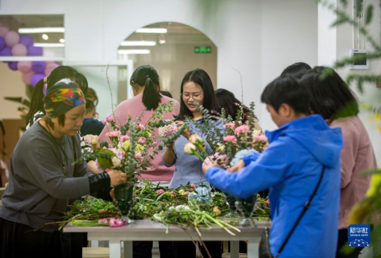 3月8日,游客在昆明斗南花卉市场体验插花。