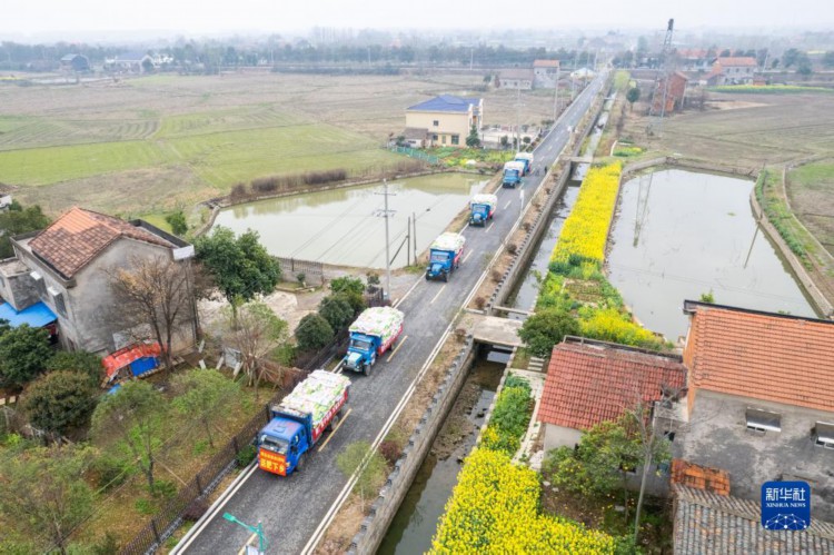 3月8日,送肥下乡的车队行驶在湖南省常德市澧县梦溪镇的道路上(无人机照片)。
