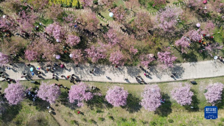 这是3月8日拍摄的都江堰市青城山镇“问花村”樱花大道一角(无人机照片)。