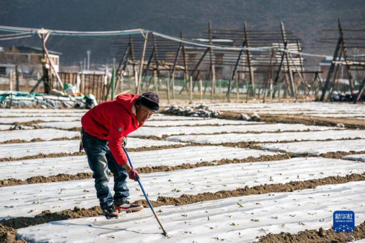 3月8日,在香格里拉市建塘镇,农民给种植的莴笋覆盖地膜。