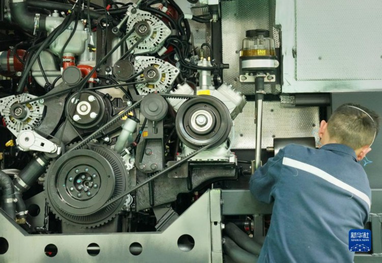 3月8日,工作人员在宇通新能源厂区高端及海外承装车间进行发动机检测。