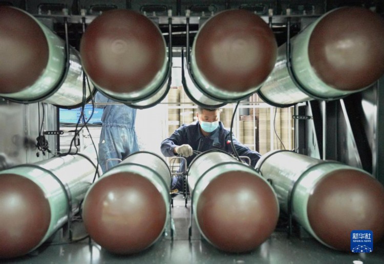 3月8日,工作人员在宇通新能源厂区高端及海外承装车间装配车辆天然气管路。