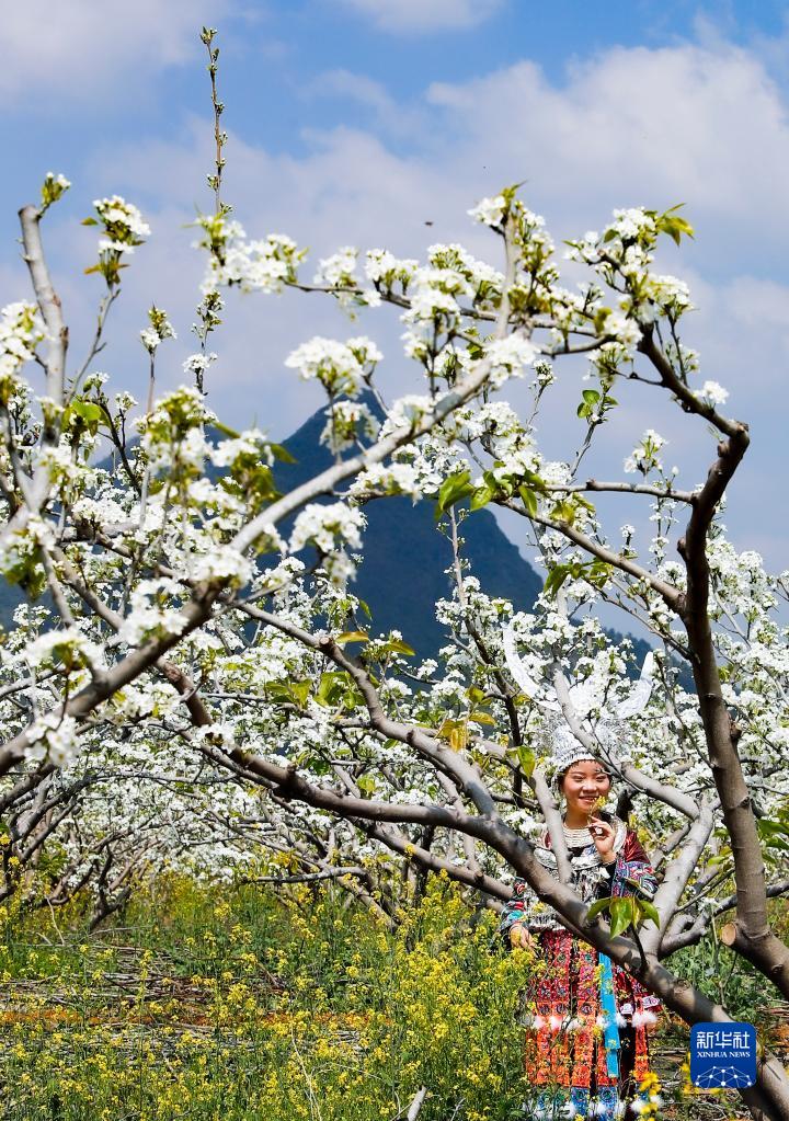 近日,广西柳州市融安县潭头乡梨花盛开,吸引游人前来游玩拍照。