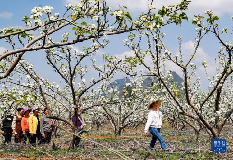 近日,广西柳州市融安县潭头乡梨花盛开,吸引游人前来游玩拍照。
