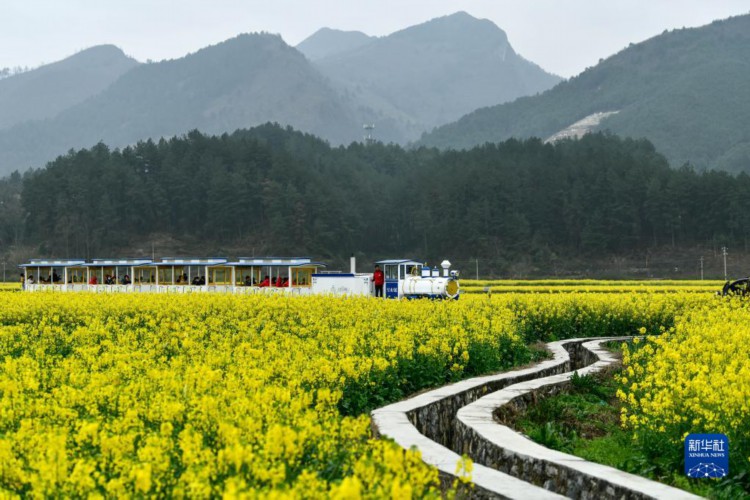 3月12日,在贵州省贵定县盘江镇“金海雪山”景区,游客乘坐观光小火车观赏油菜花。