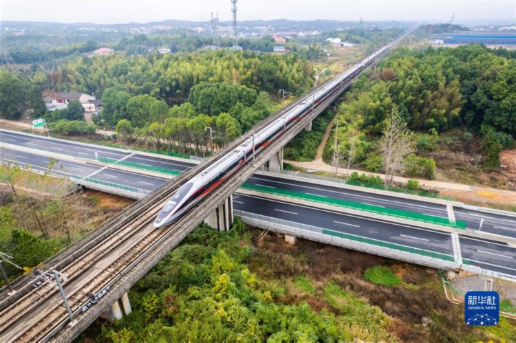 2022年11月28日,高铁列车从湖南省首条智慧高速——湖南平江(湘赣界)至益阳高速公路上方驶过(无人机照片)。新华社记者 陈思汗 摄