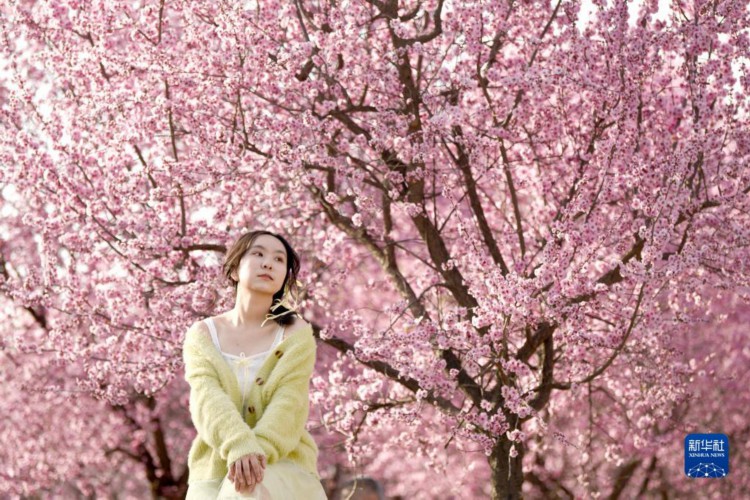 3月14日,游人在西安大明宫国家遗址公园内赏花留影。