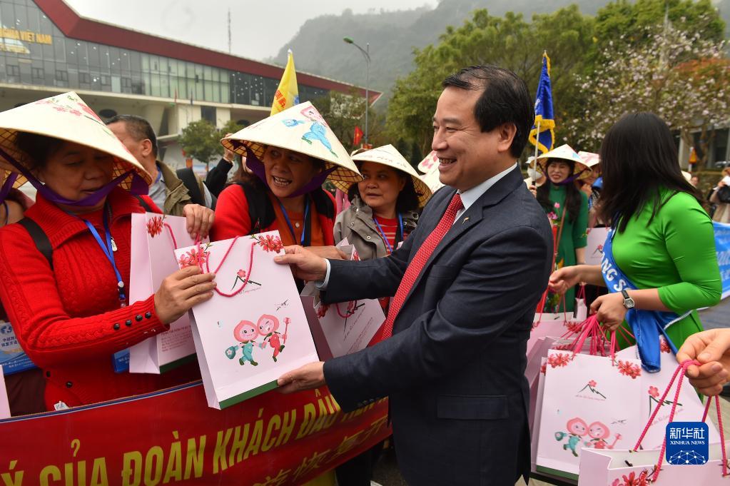 3月15日,在越南谅山省的友谊国际口岸,越南文化体育与旅游部旅游总局副局长何文超(前右二)向中国游客发放纪念品。