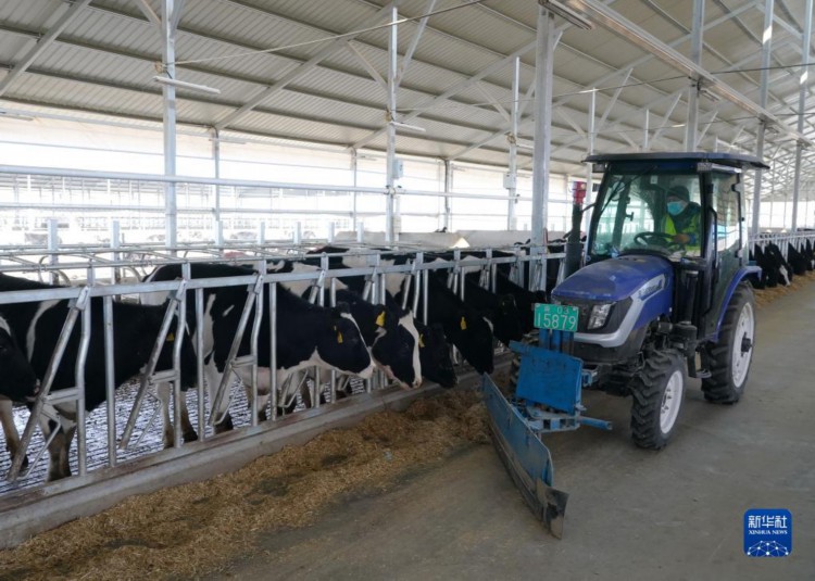 3月15日,秦皇岛市抚宁区留守营镇一家奶牛养殖企业的工人在牛舍内工作。
