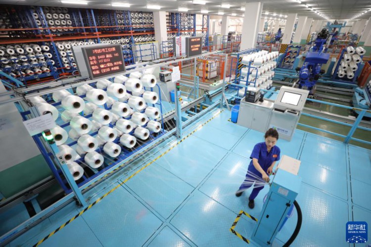 3月15日,在恒力(苏州)产业园内的高性能涤纶工业丝智能车间内,员工对工业丝进行包装前的外检。