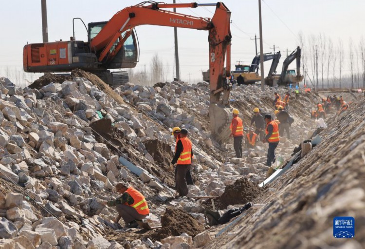 3月19日,工人在唐山市丰南区西葛镇东尖坨一村高标准农田灌溉水渠改造工地施工。