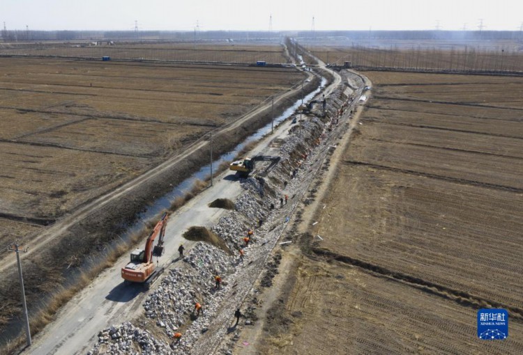3月19日,工人在唐山市丰南区西葛镇东尖坨一村高标准农田灌溉水渠改造工地施工(无人机照片)。