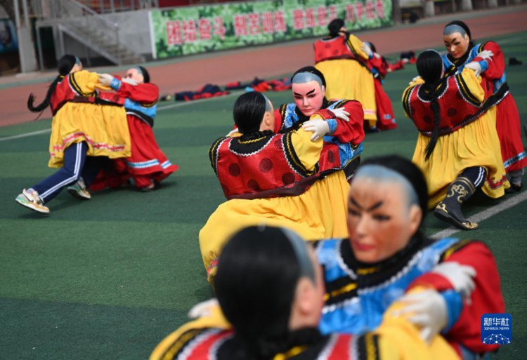 3月20日,隆化县职教中心学生在练习国家级非遗项目“二贵摔跤”。