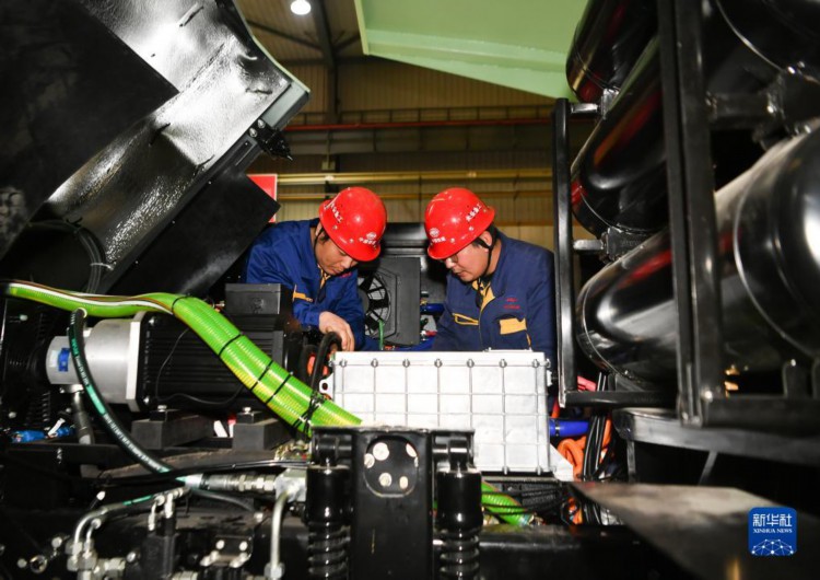 3月22日,中铁长安重工有限公司的工人在生产线上调试即将下线的95吨纯电动矿用自卸车。 当日,由中铁长安重工有限公司自主研制的95吨纯电动矿用自卸车在西安市阎良区批量下线。近年来,该公司研制的大吨位电机车组、纯电动装载机、纯电动出渣装备等新能源工程设备产销两旺,助力绿色生产。 新华社记者 张博文 摄