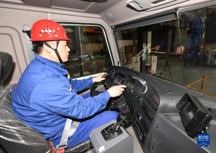 3月22日,中铁长安重工有限公司的工人在生产线上试乘即将下线的95吨纯电动矿用自卸车。 当日,由中铁长安重工有限公司自主研制的95吨纯电动矿用自卸车在西安市阎良区批量下线。近年来,该公司研制的大吨位电机车组、纯电动装载机、纯电动出渣装备等新能源工程设备产销两旺,助力绿色生产。 新华社记者 张博文 摄