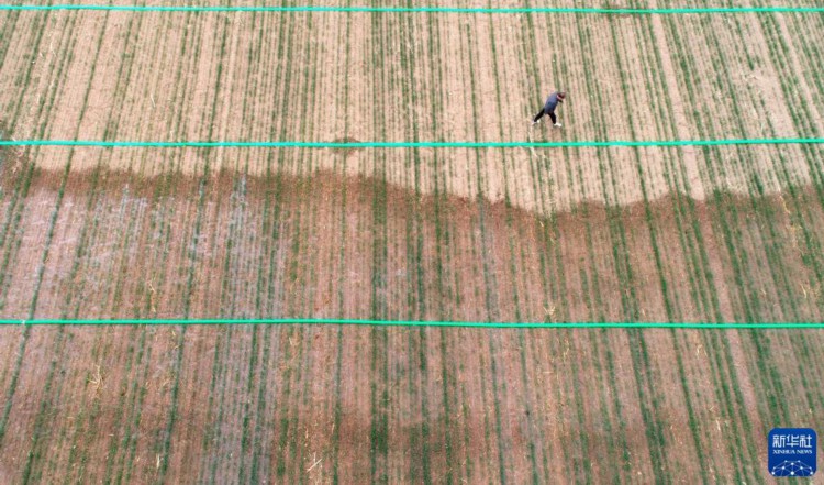 3月22日,在石家庄市栾城区南高村,村民采用微喷设备对小麦进行灌溉(无人机照片)。
