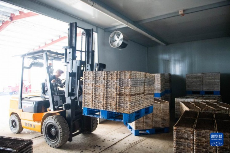 3月22日,在桃源县金凤桥水稻育秧工厂,村民驾驶叉车把处理好的秧盘放入密室催芽。