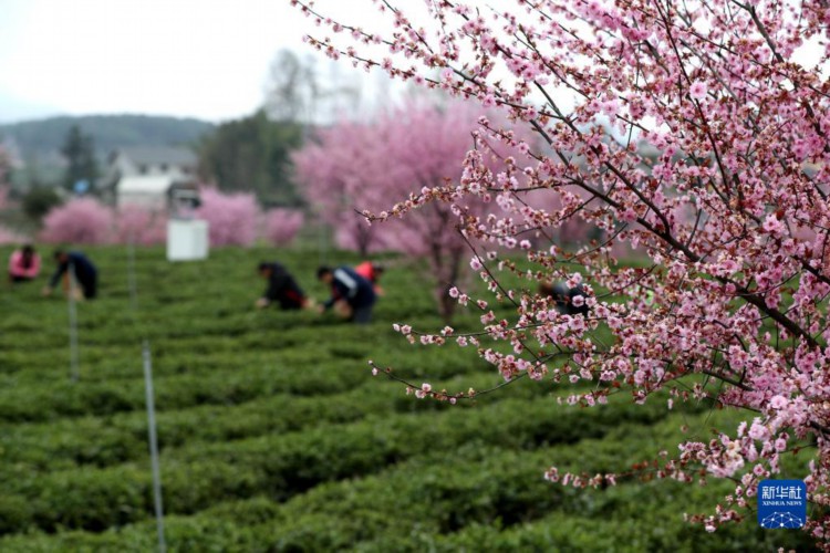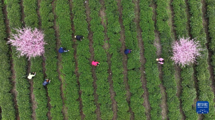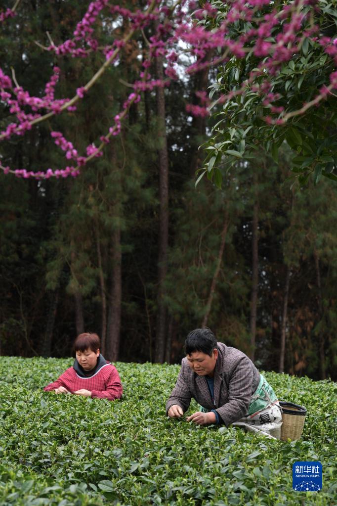 3月23日,村民在凤冈县永安镇田坝社区生态茶园基地采摘春茶。