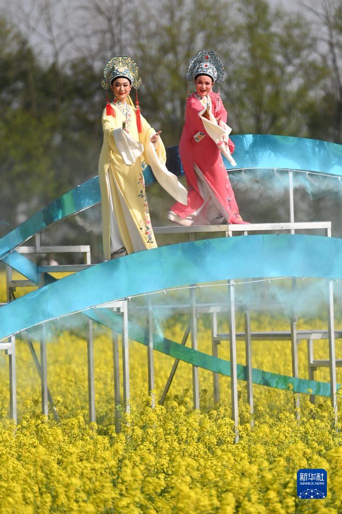 3月26日,越剧演员在梅蓉村油菜花田里的舞台上表演。 当日,在2023中国·桐庐山水艺术季活动期间,一场名为“在富春金黄的日子里”的沉浸式演出在浙江省桐庐县桐君街道梅蓉村上演,吸引游客驻足欣赏。 新华社记者 黄宗治 摄