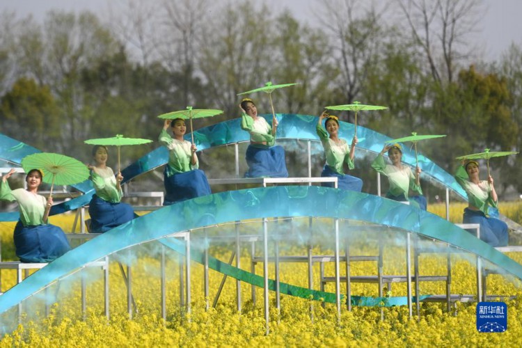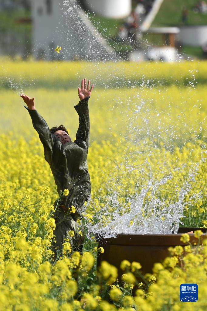 3月26日,演员在梅蓉村的油菜花田里表演。 当日,在2023中国·桐庐山水艺术季活动期间,一场名为“在富春金黄的日子里”的沉浸式演出在浙江省桐庐县桐君街道梅蓉村上演,吸引游客驻足欣赏。 新华社记者 黄宗治 摄