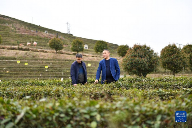 3月12日,湖南紫金茶叶科技发展有限公司负责人罗新亮(右)在新化县奉家镇渠江源村一处生态茶园查看茶叶长势。