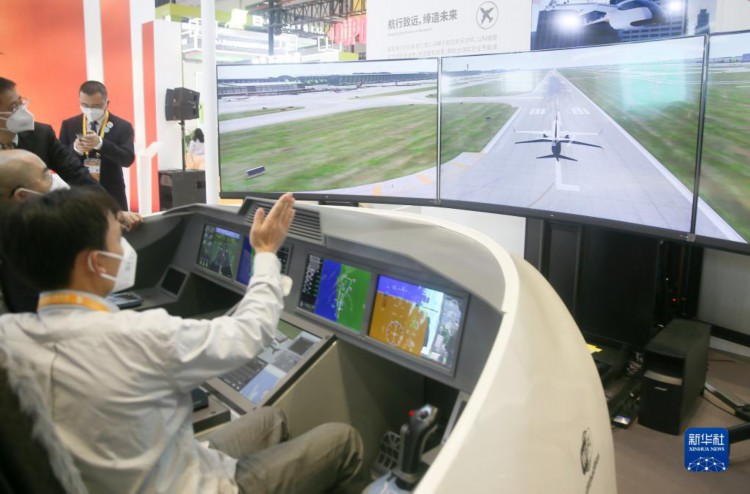 在第五届进博会技术装备展区霍尼韦尔展台,参观者在工作人员指导下体验模拟飞行(2022年11月5日摄)。新华社记者 张可任 摄