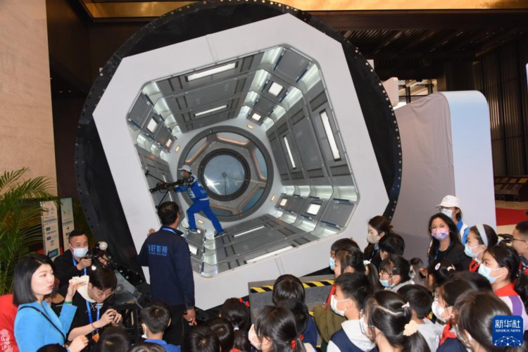 3月27日,小学生在观看“流浪地球”太空舱演示项目。