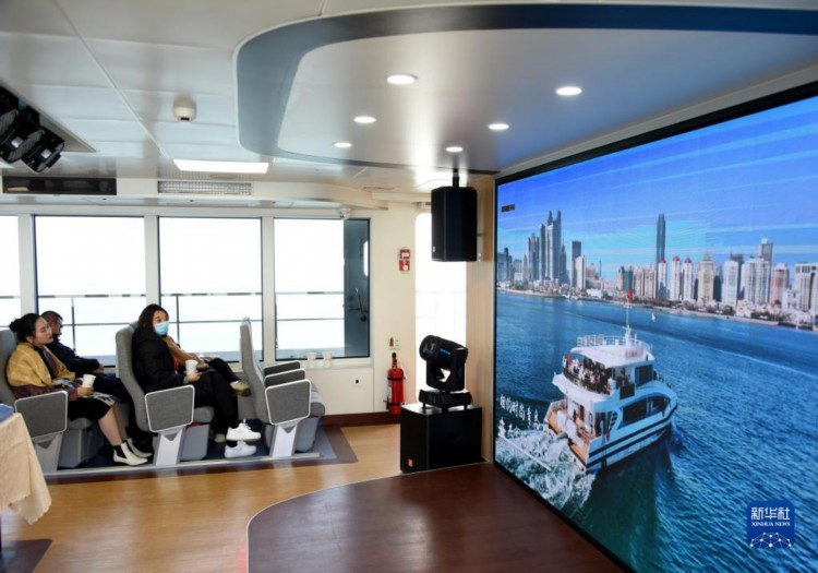 3月27日,游客在游船上观看青岛文旅推介宣传片。 近日,随着山东青岛的旅游旺季到来,海上旅游逐渐回暖,串联海岸、海湾、海岛和沿海主要景点的“一程多站”式海上旅游线路,为市民和游客带来畅游青岛的便利和新体验。截至目前,青岛市已开通7条核心航线,另有5条线路正在筹备当中,届时将能满足更多团体或个性化出游群体的海上旅游需求。 新华社记者 李紫恒 摄