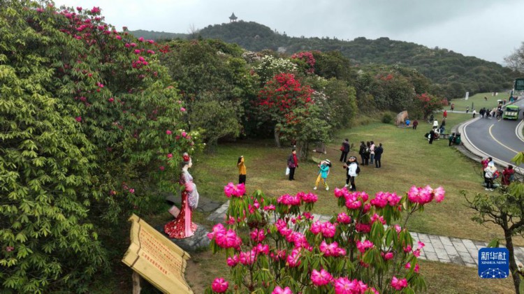 3月28日,游客在贵州省毕节市百里杜鹃风景区赏花(无人机照片)。