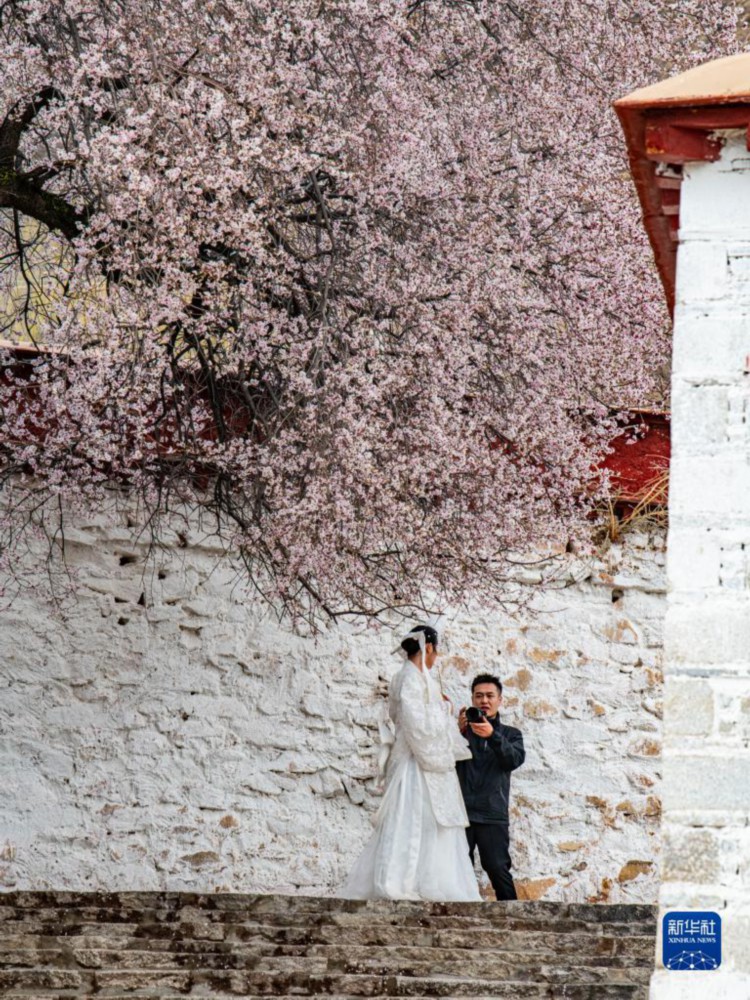 近日,位于拉萨北部山坳里的古刹帕邦喀周围桃花盛开,吸引众多游客前来观光拍照。