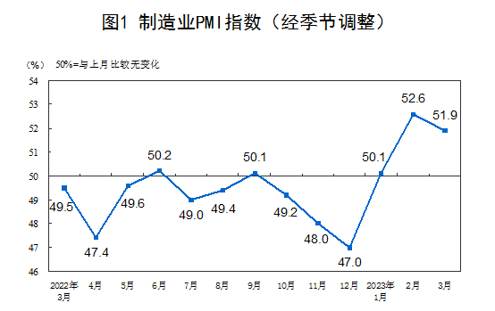 3月份,制造业采购经理指数(PMI)为51.9%,比上月下降0.7个百分点,高于临界点,制造业保持扩张态势。
