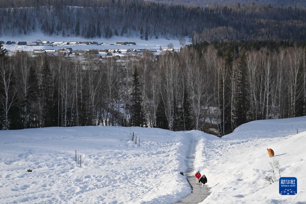 3月30日清晨,游客前往禾木村后山的观景平台。 新华社记者李响摄