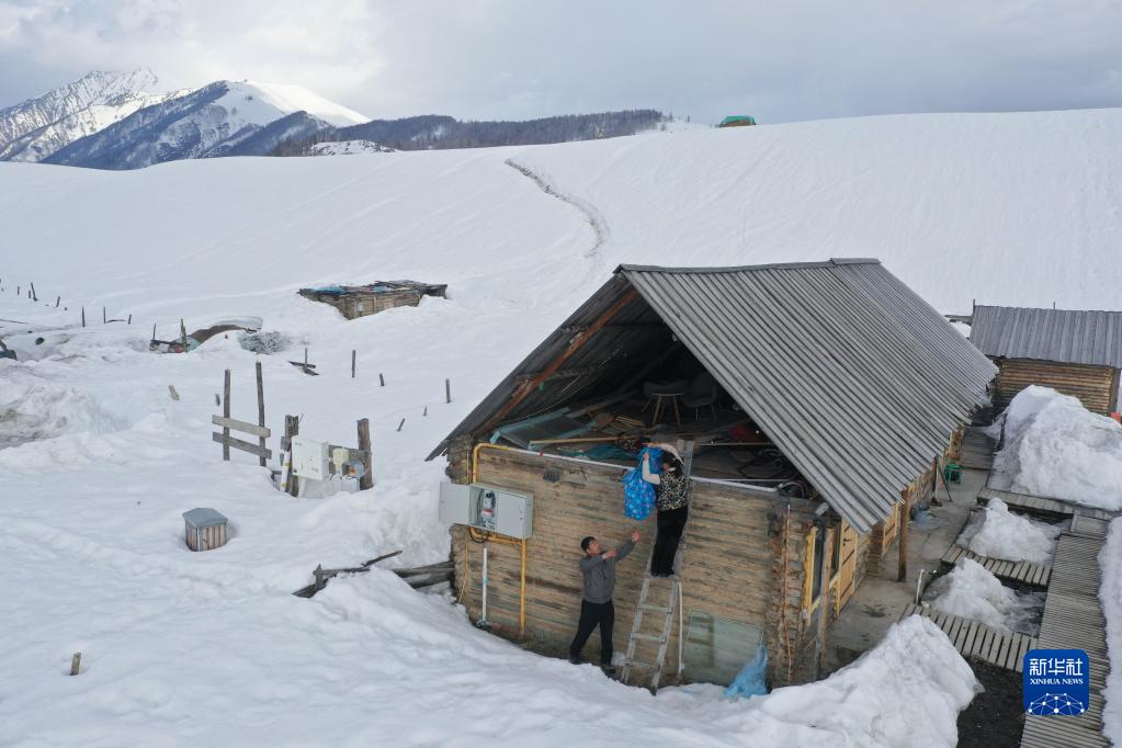 3月30日,苏卡(左)帮助村民吾云整理家中杂物(无人机照片)。 新华社记者李响摄