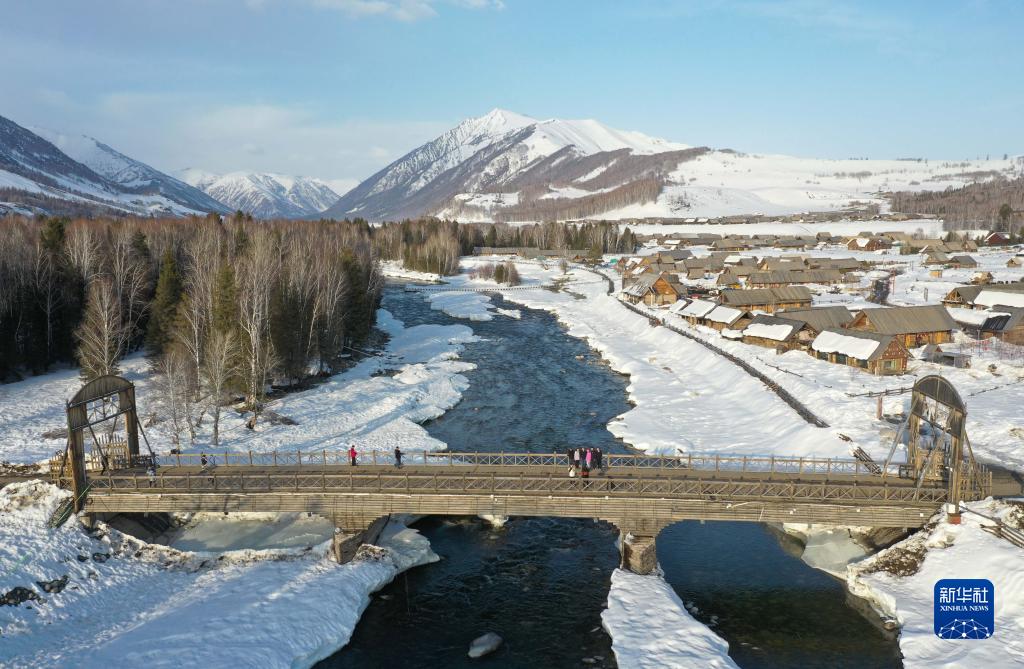3月29日,游客在禾木村的桥上合影留念(无人机照片)。 新华社记者李响摄