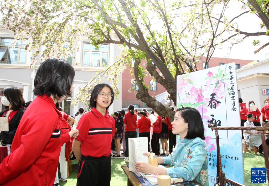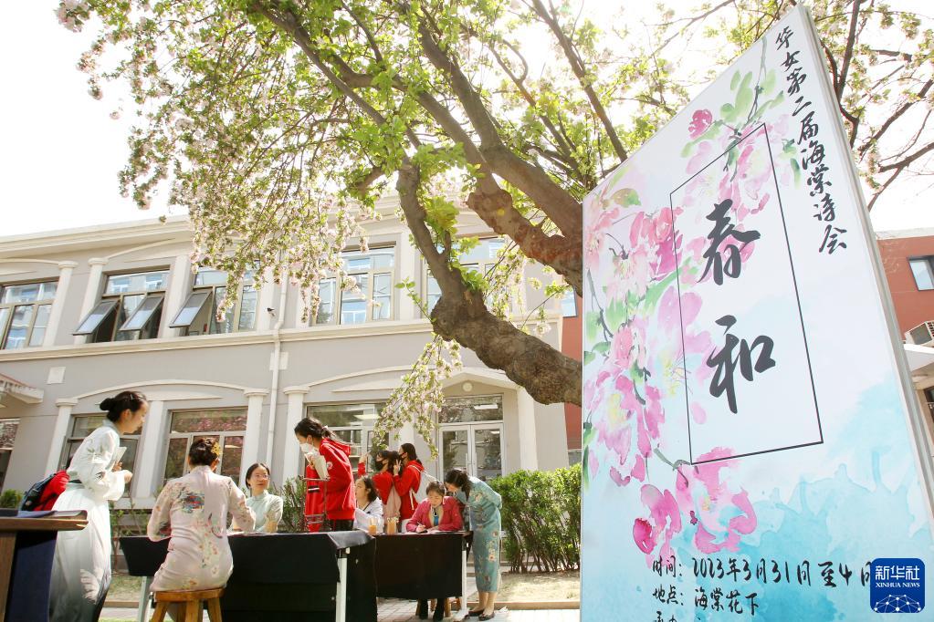 3月31日,参加“海棠诗会”的师生在交流。 当日,北师大实验华夏女子中学举办以“春和”为主题的第二届“海棠诗会”。师生们选取有关“春天”“和煦”“生机”“美好”的诗歌,在校园的海棠树下赏析吟诵,共享诗歌之美,传承中华优秀传统文化。 新华社记者 侯俊 摄