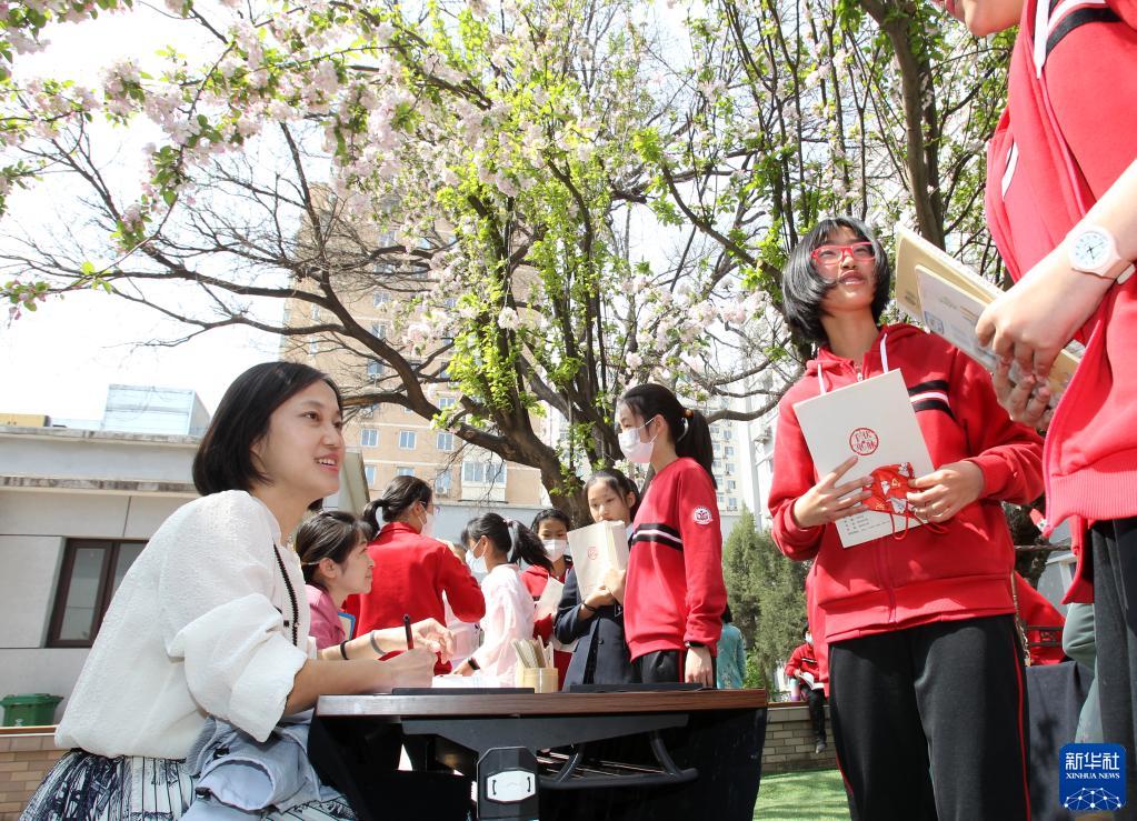 3月31日,女生迎接参加“海棠诗会”的同学。 当日,北师大实验华夏女子中学举办以“春和”为主题的第二届“海棠诗会”。师生们选取有关“春天”“和煦”“生机”“美好”的诗歌,在校园的海棠树下赏析吟诵,共享诗歌之美,传承中华优秀传统文化。 新华社记者 侯俊 摄