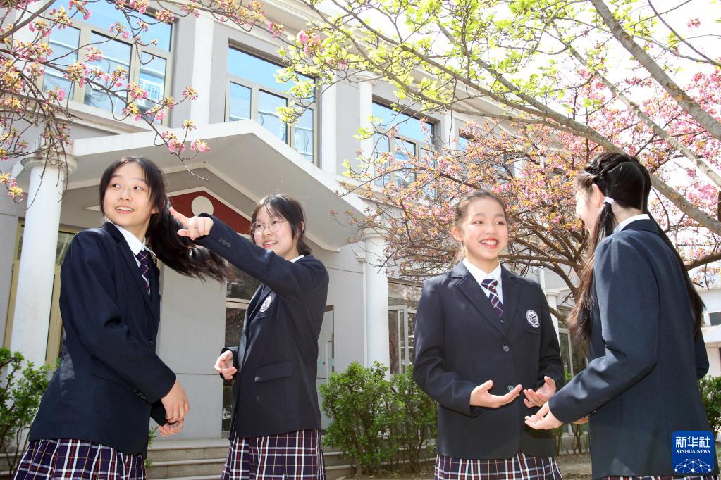 3月31日,准备参加“海棠诗会”的女生在交流。 当日,北师大实验华夏女子中学举办以“春和”为主题的第二届“海棠诗会”。师生们选取有关“春天”“和煦”“生机”“美好”的诗歌,在校园的海棠树下赏析吟诵,共享诗歌之美,传承中华优秀传统文化。 新华社记者 侯俊 摄