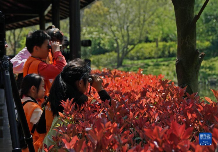 4月2日,在上海共青森林公园,小朋友们参加观鸟活动。