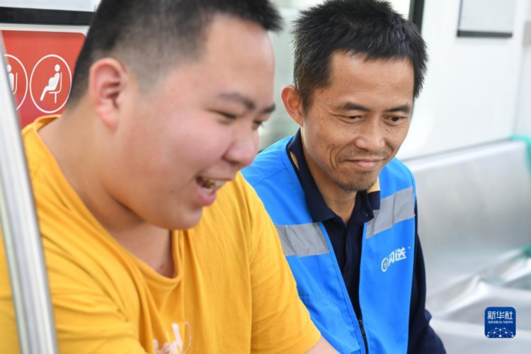4月2日,跟着爸爸送单的黄志能(左)心情不错,在地铁上跟黄少礼有说有笑。 今年44岁的黄少礼是深圳一名闪送骑手,接单跑单时总有一人相伴,就是他16岁的儿子黄志能。 黄志能2岁时确诊孤独症,出于让他多接触外面世界的想法,黄少礼跑单送货时都会带着他。父子俩每日背着包穿梭在城市的大街小巷里,抢单、送货。黄志能方向感很强,找路、换车十分熟悉,比父亲还快。“他脑子里有个地图,去哪里都找得到。”黄少礼说,“送单时,他情绪很好,跟客人都能正常沟通。我希望每天能多接单,让他的情绪保持平稳,将来能够独立生活”。 新华社记者 毛思倩 摄